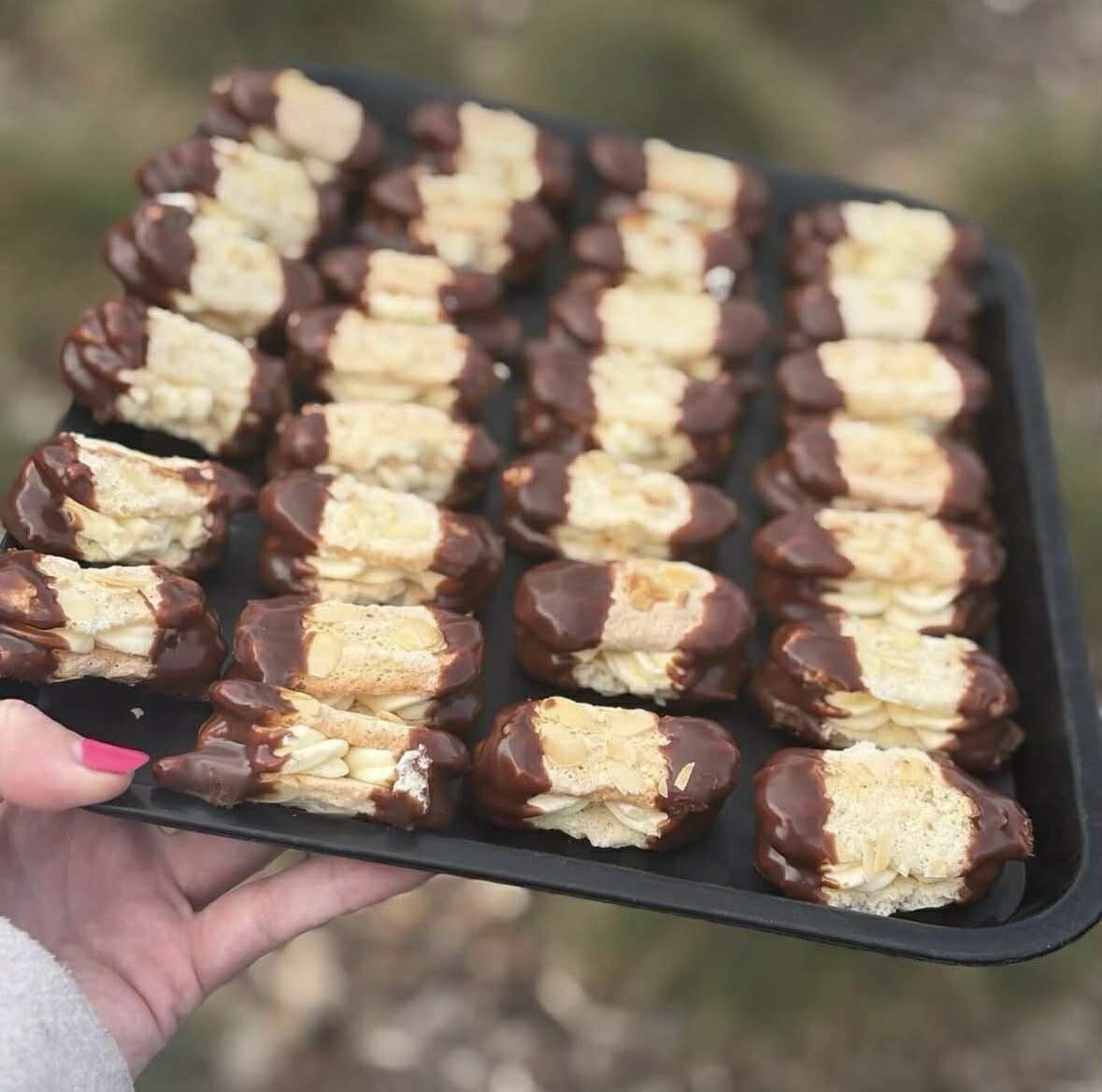 Vers gemaakte bokkenpootjes met een royale vulling van luchtige botercrème. Afgewerkt met melkchocolade, fondant of witte chocolade volledig volgens jouw voorkeur. Ideaal voor feestjes of gewoon voor bij de koffie.
